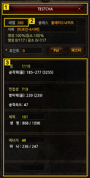 - La informacion del personaje se mostrara en la ventana de la parte superior presentando la suma del nivel general y el Maestro (Si el nivel del personaje es Master 200, se mostrara como nivel general 400 + Nivel master = Nivel total 600) - El color del nombre del personaje cambiara y se mostrara dependiendo del estado de personaje.