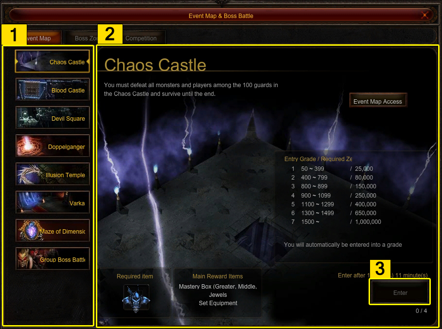 Mapa de eventos: Chaos Castle, Blood Castle, Devil Square, Doppelganger, Illusion Temple, Varka, Maze of Dimension, Boss Battle Together