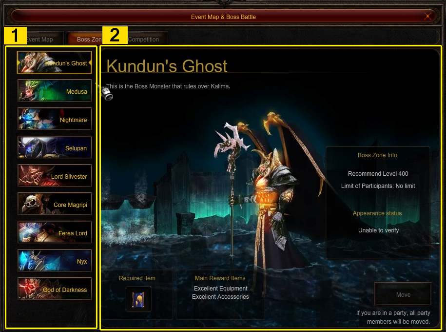 (Battle Boss) Kundun, Medusa, Nightmare, Selupan, Lord Silvester, Core Magripi, Ferea Lord, Nyx, God of Darkness