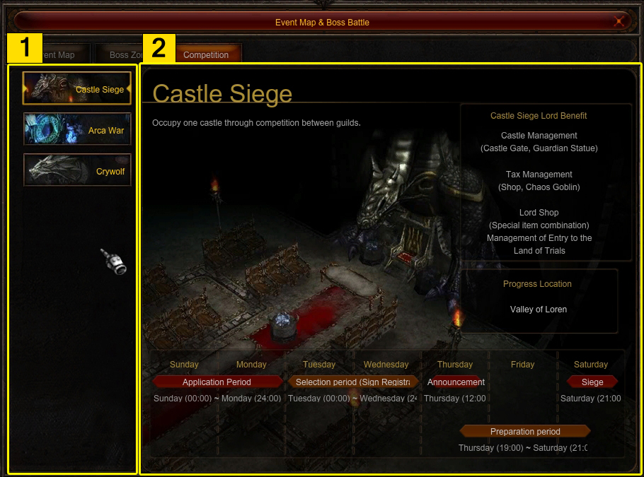 2) Puedes acceder facilmente al mapa de eventos y a la batalla contra jefes a traves de la interfaz de usuario, e incluso consultar informacion sobre el sistema competitivo (Castle Siege, Arka War, Etc).